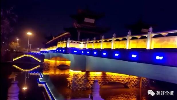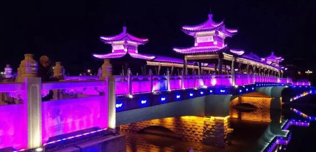 太平橋用隱藏式的瓦楞投光燈照亮建筑屋面,變幻四季顏色,絢麗多彩,形成一定的韻律感,河中倒影給人波光粼粼的勝境,整體氣勢恢弘,在橋的欄桿下一側(cè)用定制的祥云圖案燈順序排列,寓意祥和、太平,突出太平盛世文化。